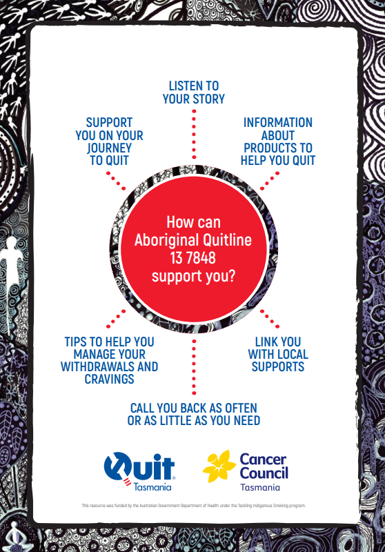 A flyer for palawa people outlining information about support for Aboriginal peoples and access to free nicotine replacement and medications.