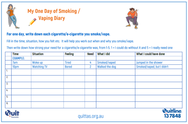 • My Diary of 1 Day of Smoking / Vaping. For one day clients write down each cigarette / e-cigarette they smoke / vape or crave. This will help them work out their triggers for smoking or vaping and encourage them to think about what they could do instead.
